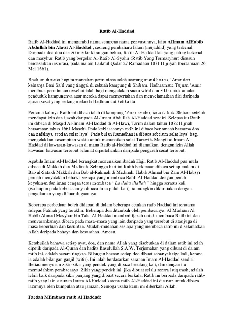 Teks bacaan ratib al haddad dalam kesempatan kali ini kami akan memberikan bacaan wirid karya al allamah al imam al habib abdullah bin alwi al haddad yang dikenal dengan nama ratib haddad. That allah accepts our solah and our doa. Doa fatihah imam al hadad.